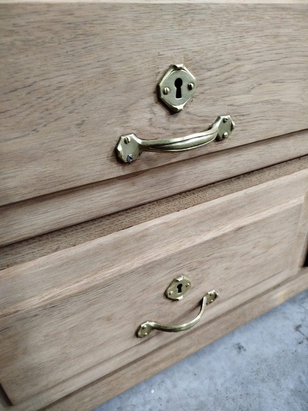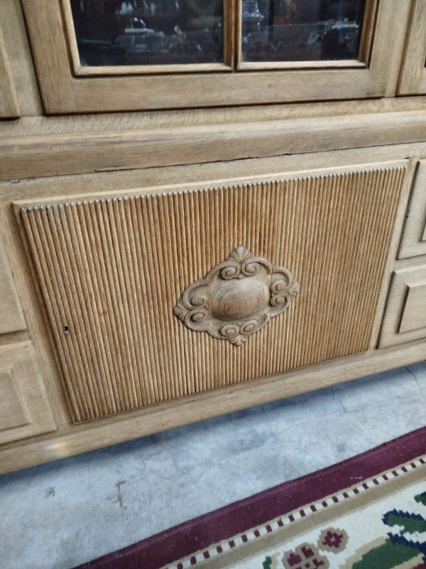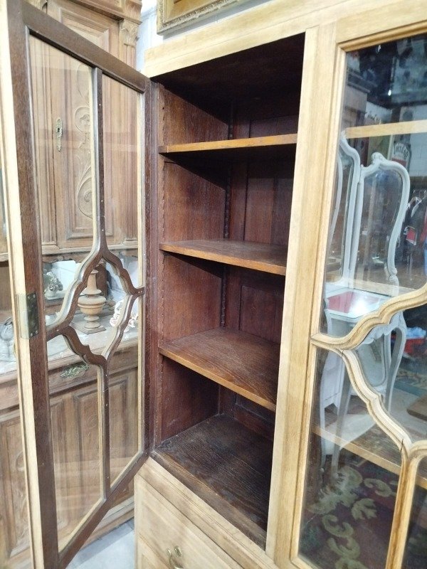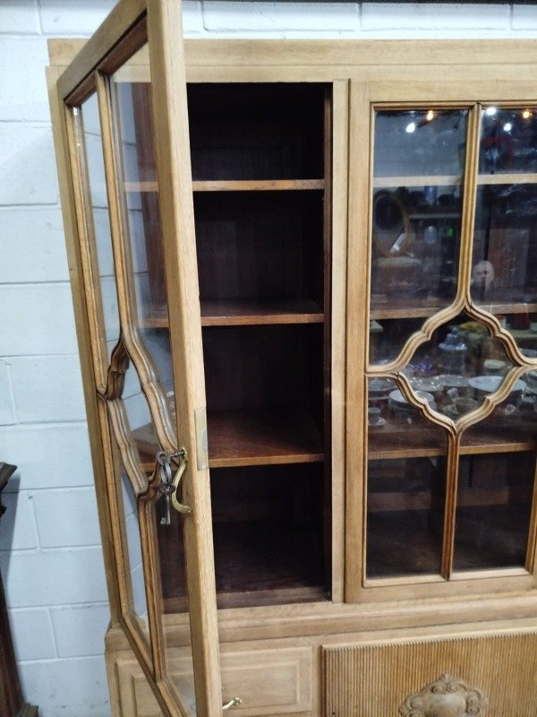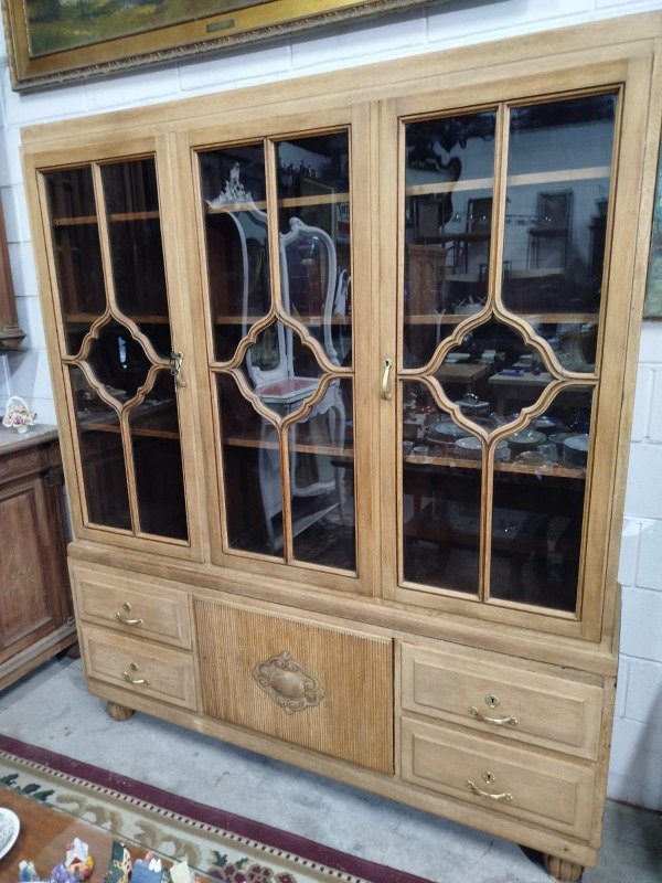 Madera lavada al natural 7 estantes y 4 cajones. Puertas de cristal repartido todo con cerradura y llaves funcionando perfectamente.