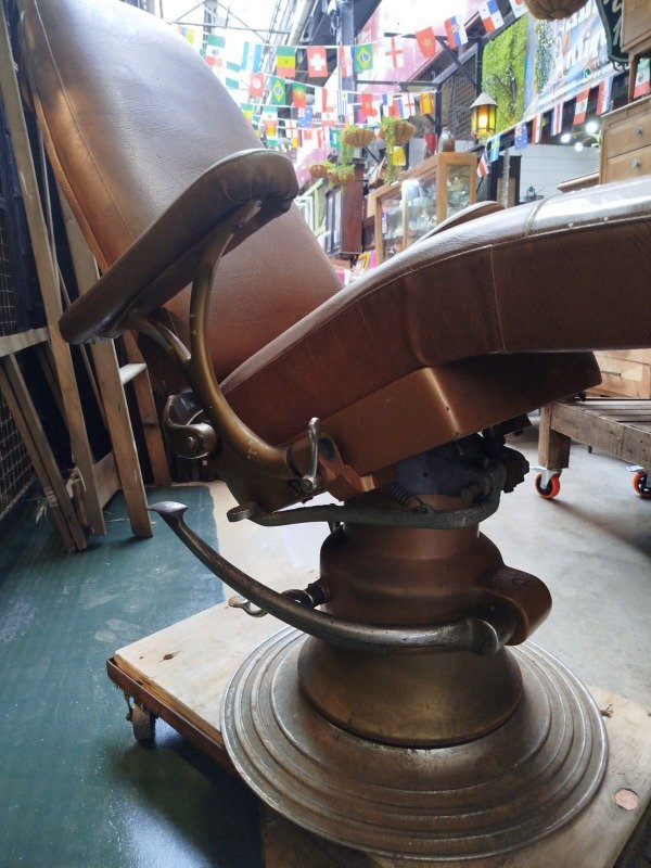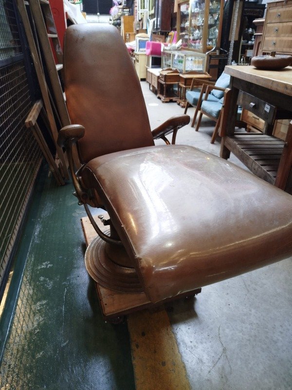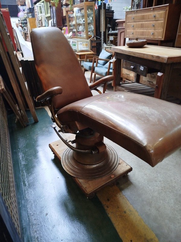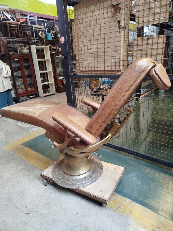 Antiguo sillón hidráulico de dentista. Muy bien cuidado. Funciona su sistema hidráulico se rebate por completo. Tapizado cuero vintage original sano